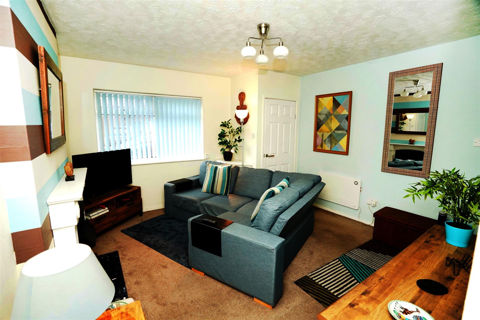 UPVC double glazed window to front, built-in under-stairs storage cupboard, electric panel heater, wall mounted electric panel heater, carpeted stairs to first floor landing, door to:
