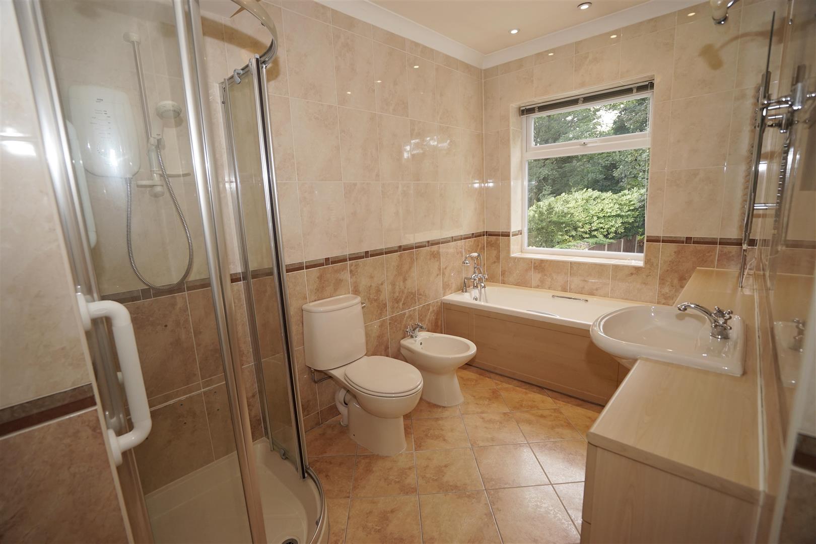 Fitted with five piece suite comprising deep panelled bath, inset wash hand basin in vanity unit with cupboards under and mixer tap, tiled shower enclosure with electric shower over, bidet and low-level WC, full height ceramic tiling to all walls, heated towel rail, extractor fan, uPVC double glazed window to rear, built-in airing cupboard housing, factory lagged hot water cylinder, radiator, ceramic tiled flooring, coving to ceiling with recessed low-voltage spotlights, door to: