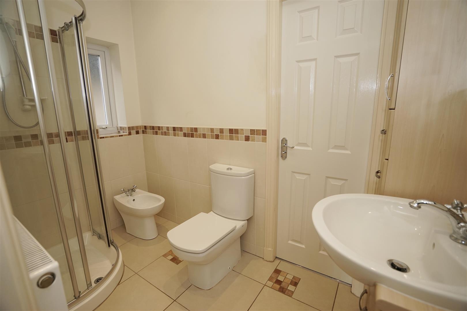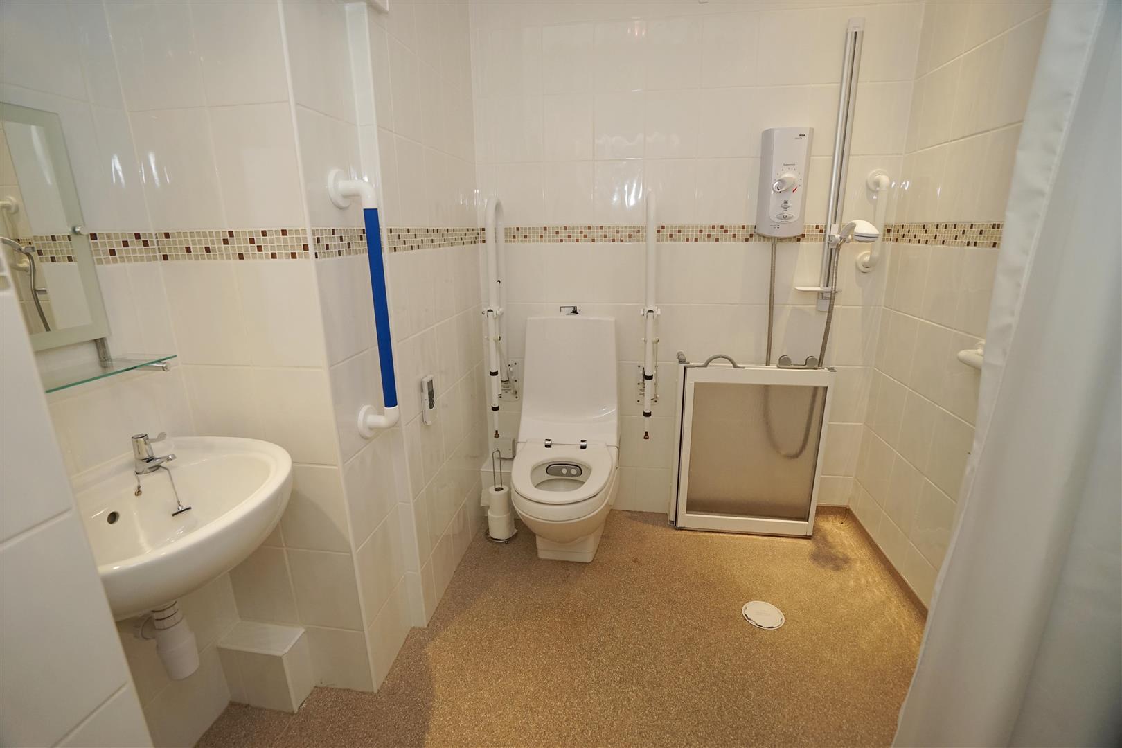 built for disabled access and fitted with a three piece modern white suite comprising tiled shower area with electric shower over, pedestal wash hand basin, low-level WC with remote operation and heated towel rail, extractor fan full height ceramic tiling to all walls.