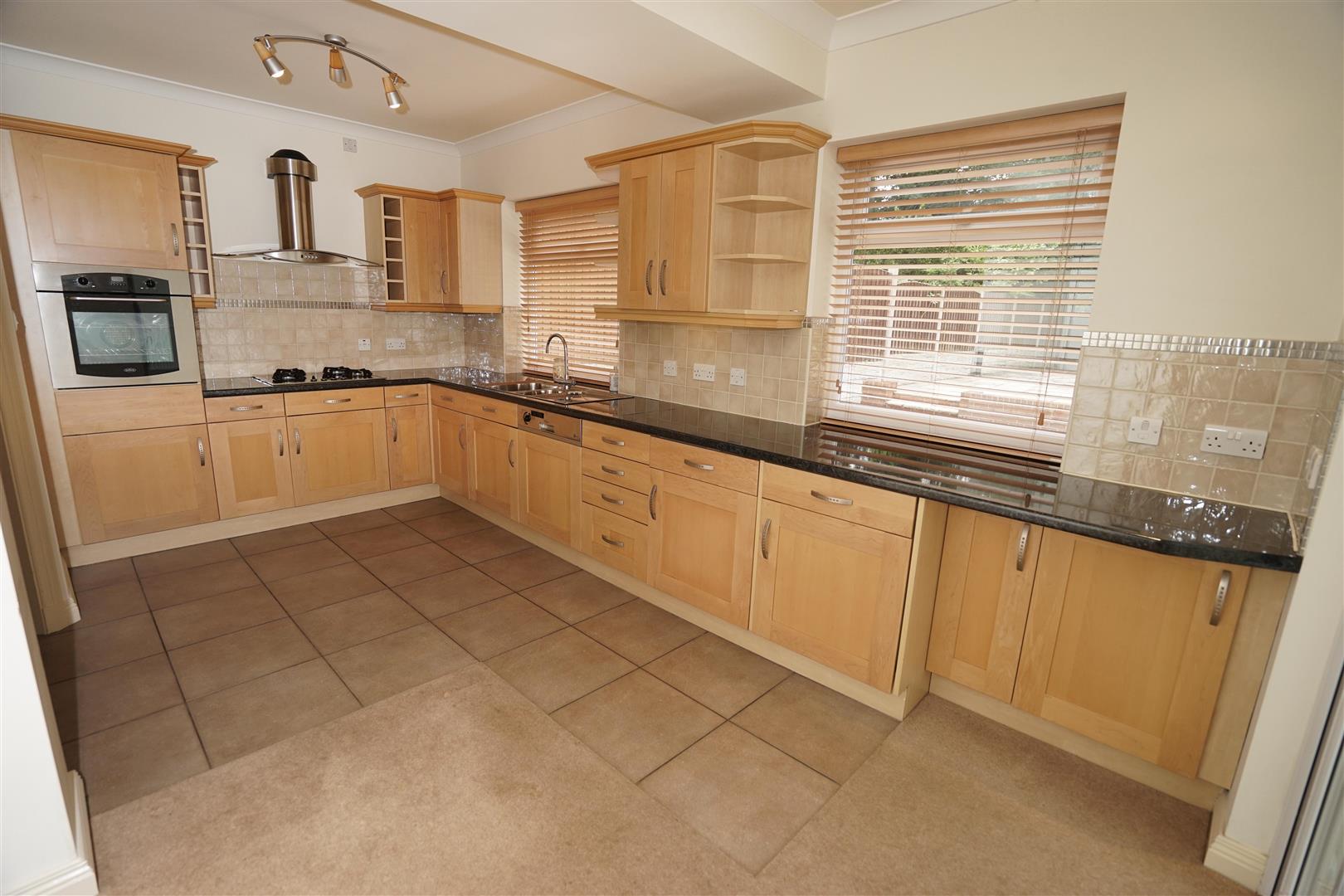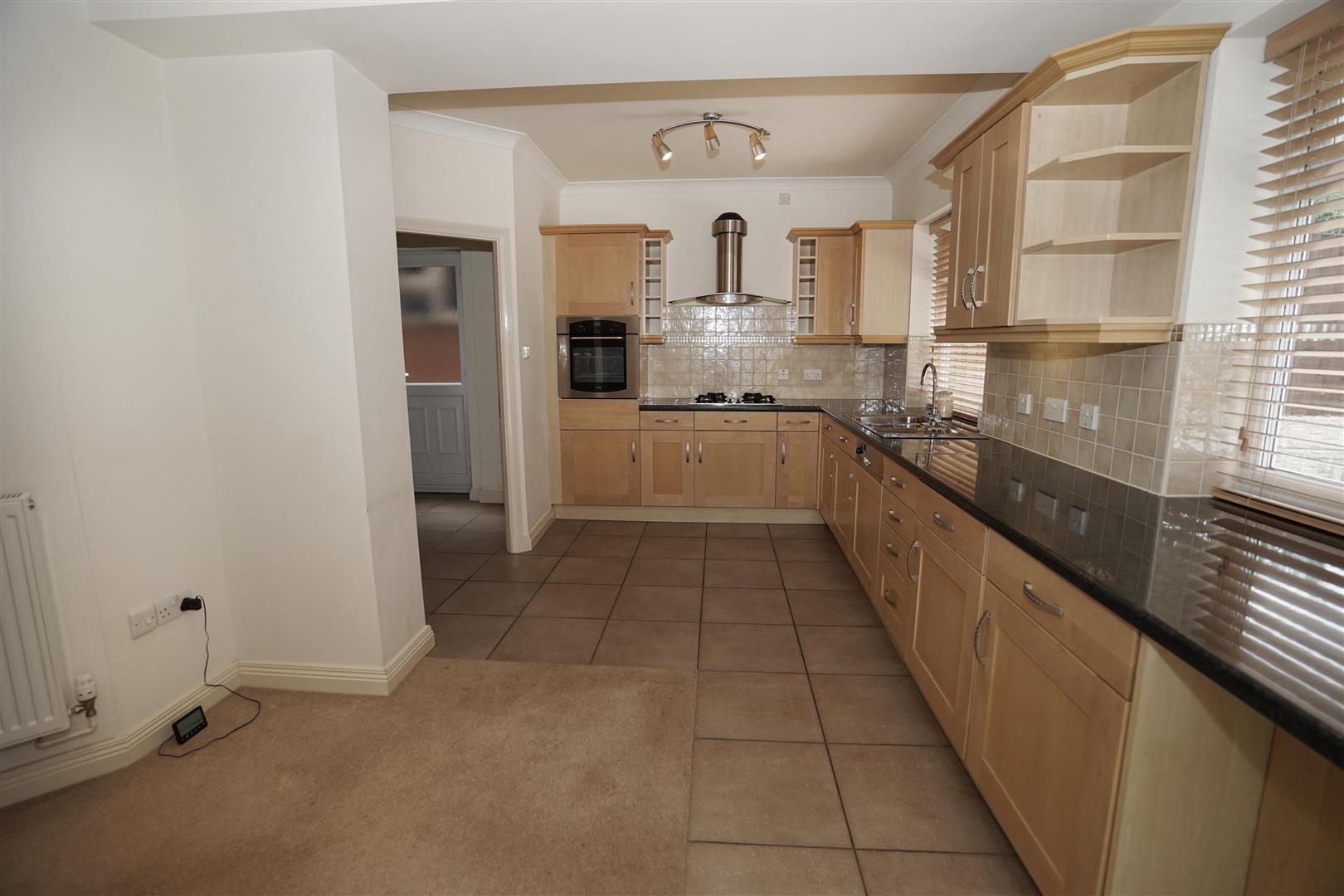 Fitted with a matching range of base and eye level units with underlighting, drawers, cornice trims and contrasting worktop space over, wine rack, corner display shelves, 1+1/2 bowl stainless steel sink unit with single drainer and mixer tap with tiled splashbacks, integrated fridge, freezer and dishwasher, eye level electric fan assisted oven, four ring gas hob with extractor hood over, two uPVC double glazed windows to rear, double radiator, part ceramic tiled flooring, coving to ceiling with recessed low-voltage spotlights, uPVC double glazed french double doors to Conservatory, door to: