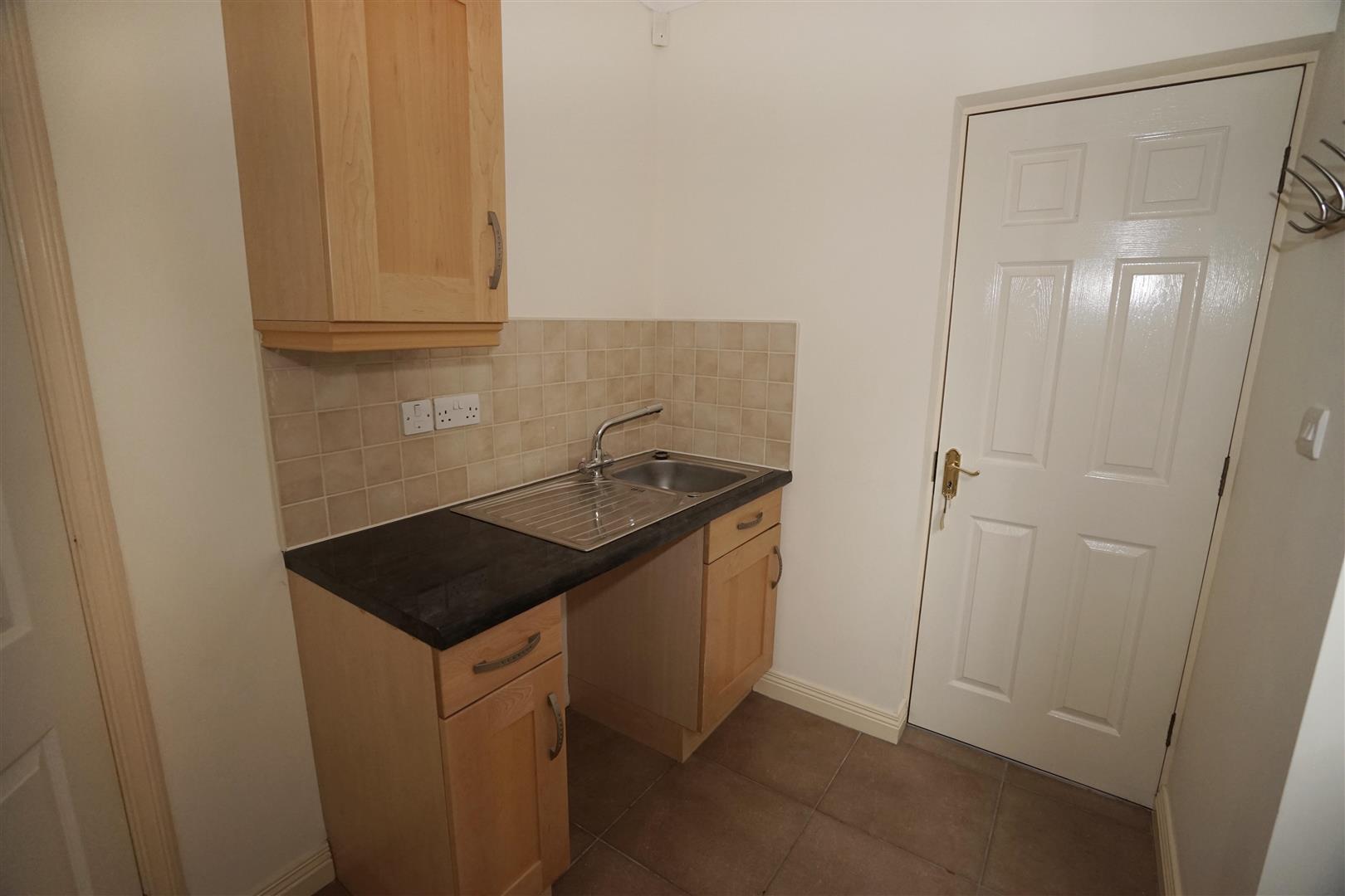 Fitted with a matching range of base and eye level units and cupboards with contrasting worktop space over, plumbing for washing machine, radiator, ceramic tiled flooring, door to: