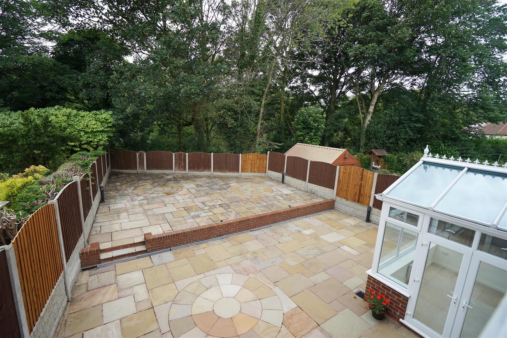 Rear garden, enclosed by timber fencing to rear and sides, large split level Indian stone paved sun patio, courtesy lighting boiler house to side, outside tap, gated side access.