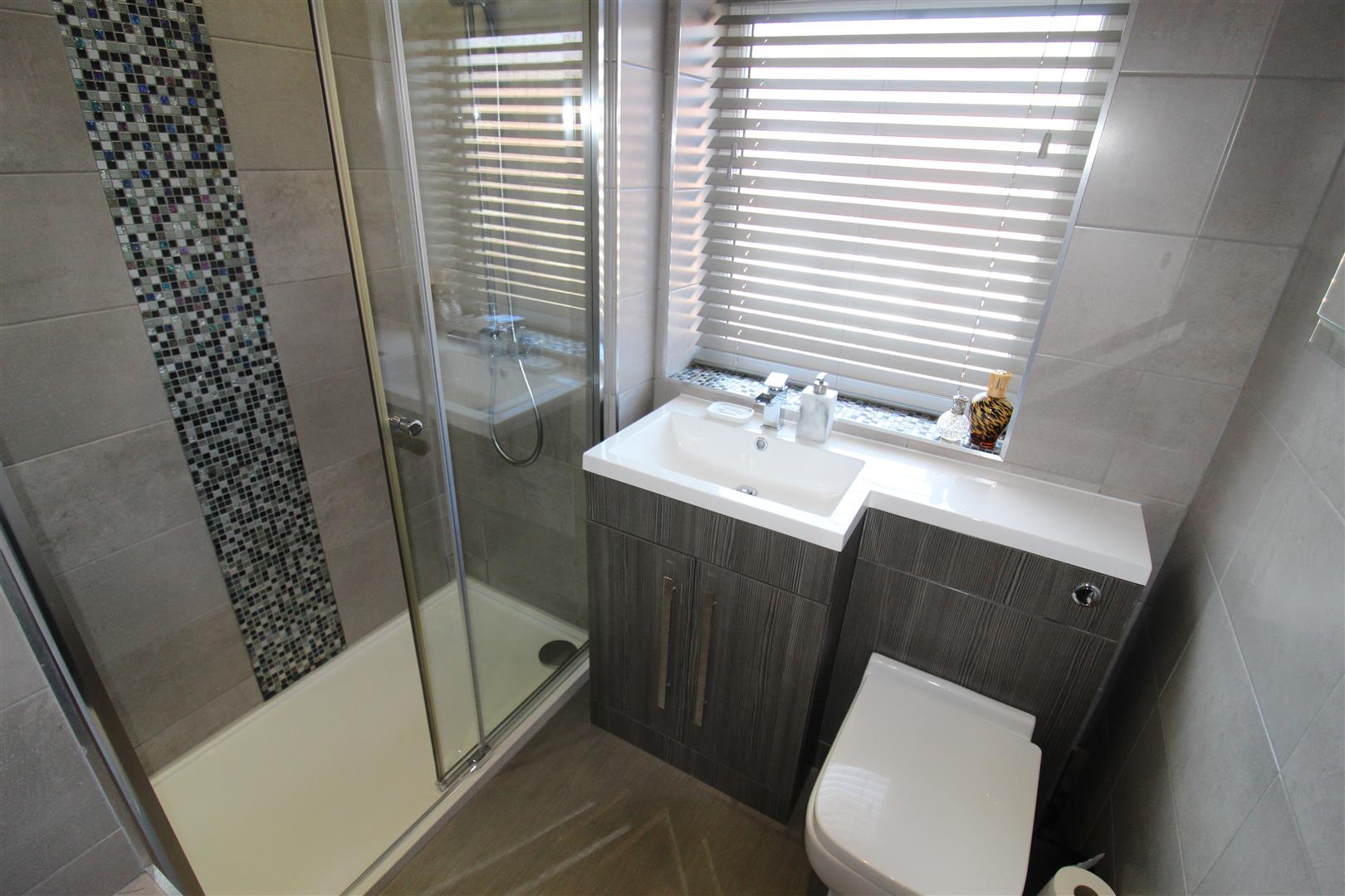 Three piece suite comprising vanity wash hand basin with cupboard under, mixer tap and ceramic and full height tiling to all walls, recessed tiled shower enclosure with glass screen and close coupled WC, uPVC frosted double glazed window to front, heated towel rail: