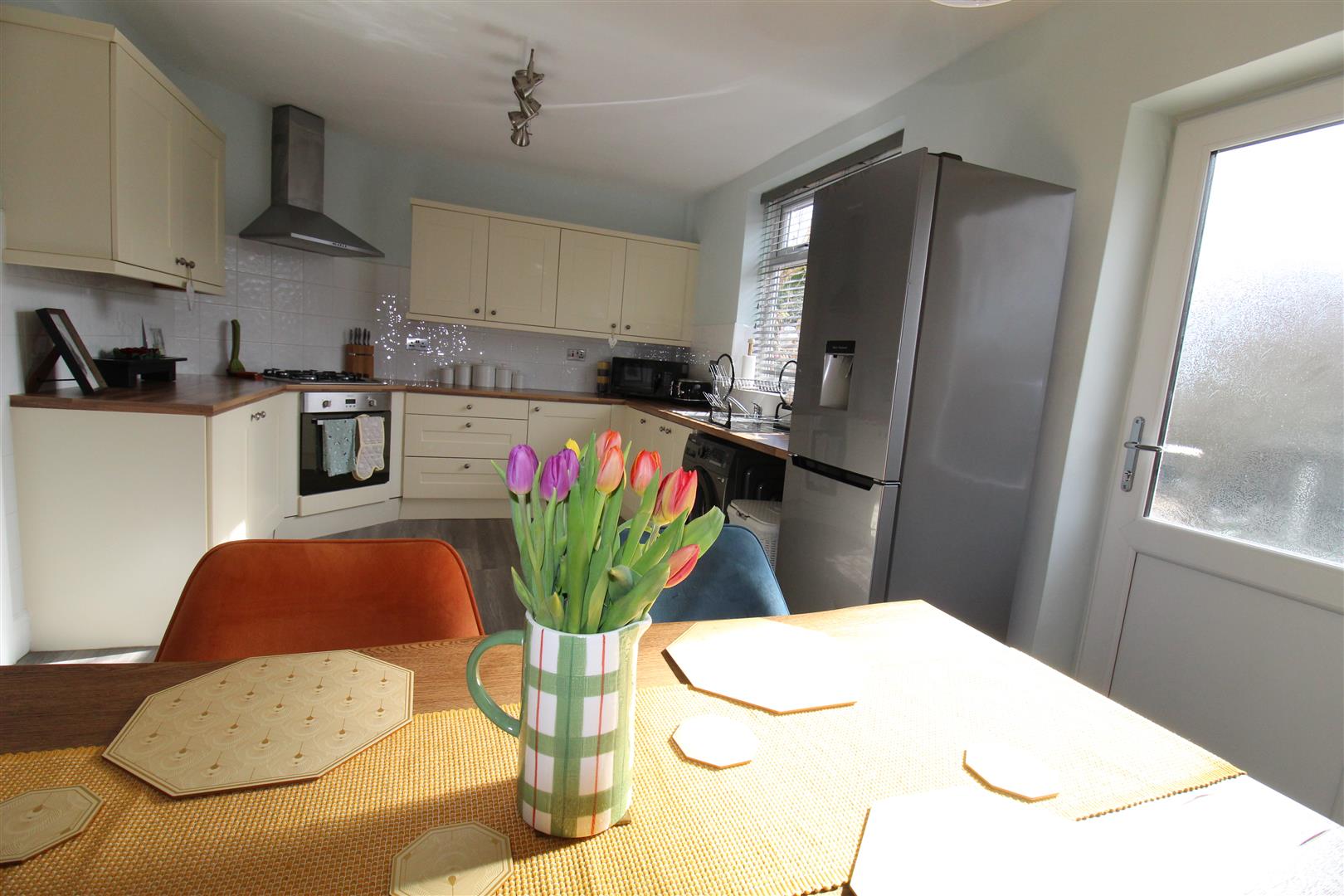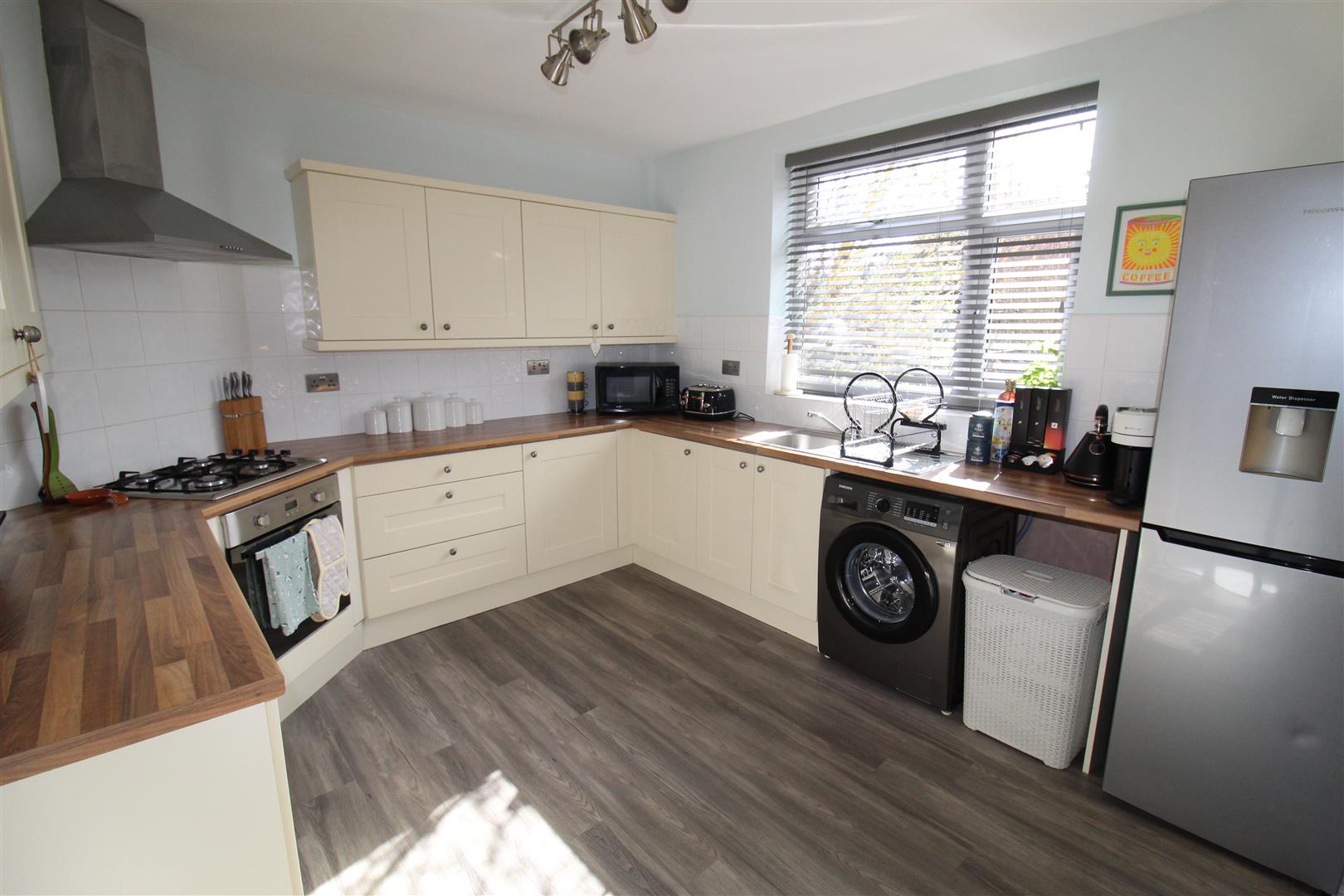 Fitted with a matching range of base and eye level units with cornice trims and round edged worktops, drawers, stainless steel sink with single drainer and mixer tap, plumbing for automatic washing machine, space for fridge/freezer, built-in electric fan assisted oven, built-in four ring gas hob with extractor hood over, uPVC double glazed window to rear, double radiator, uPVC double glazed opaque entrance door to rear: