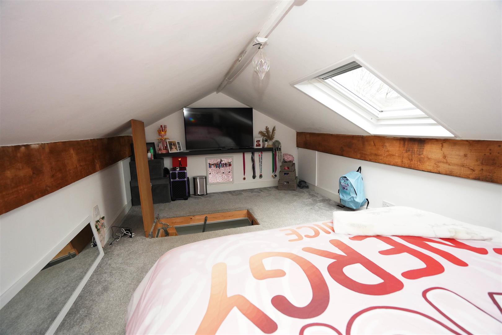 Pull down timber ladder giving access to boarded loft area fully plastered with velux roof light and central heating radiator, access to boarded loft area, door to: