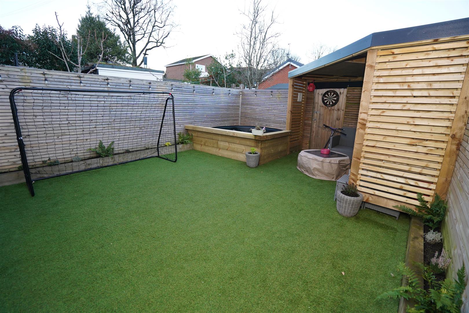 Rear private garden with artificial lawned area, , outside cold water tap and power socket , timber fencing to rear and side. timber open plan summerhouse and plunge pool.