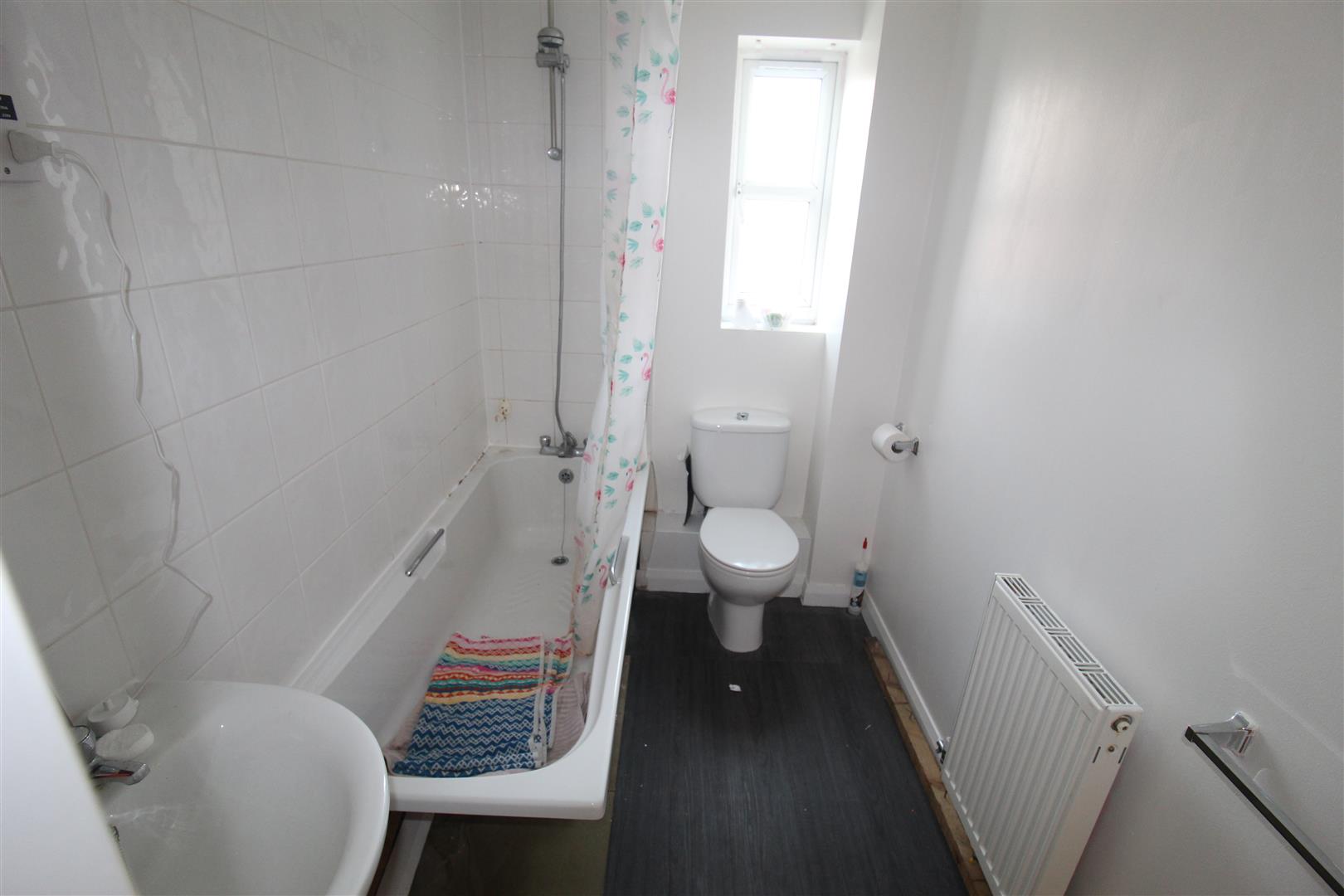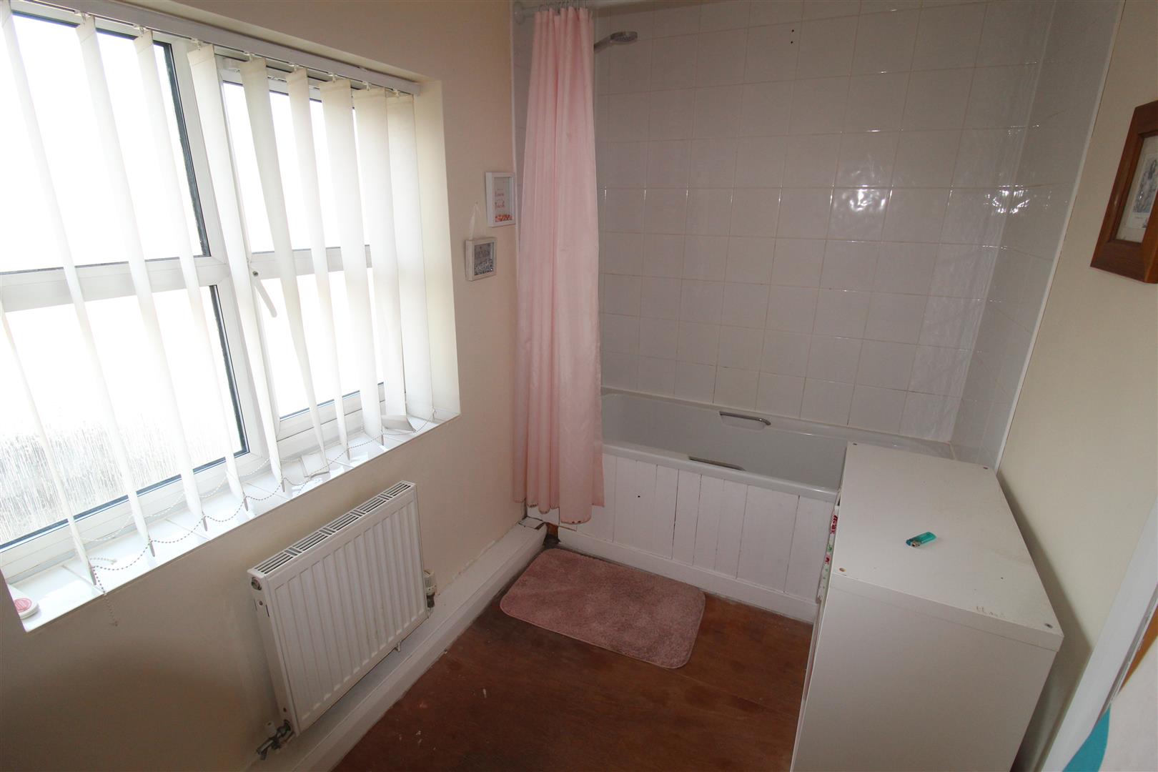 Three piece suite comprising deep panelled bath, pedestal wash hand basin, shower with above and low-level WC, tiled surround, uPVC frosted double glazed window, radiator.