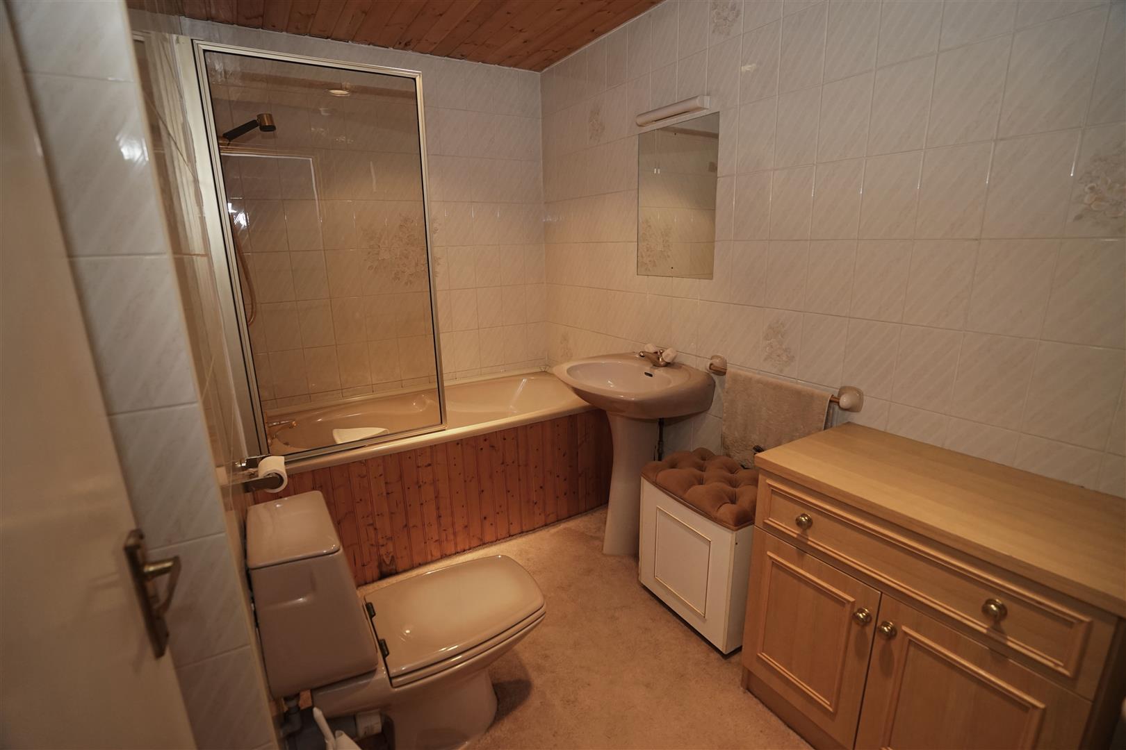 Fitted with three piece coloured suite comprising deep panelled bath with shower over and glass screen, pedestal wash hand basin with mixer tap and low-level WC, full height ceramic tiling to all walls, electric fan heater, extractor fan, shaver point and light.