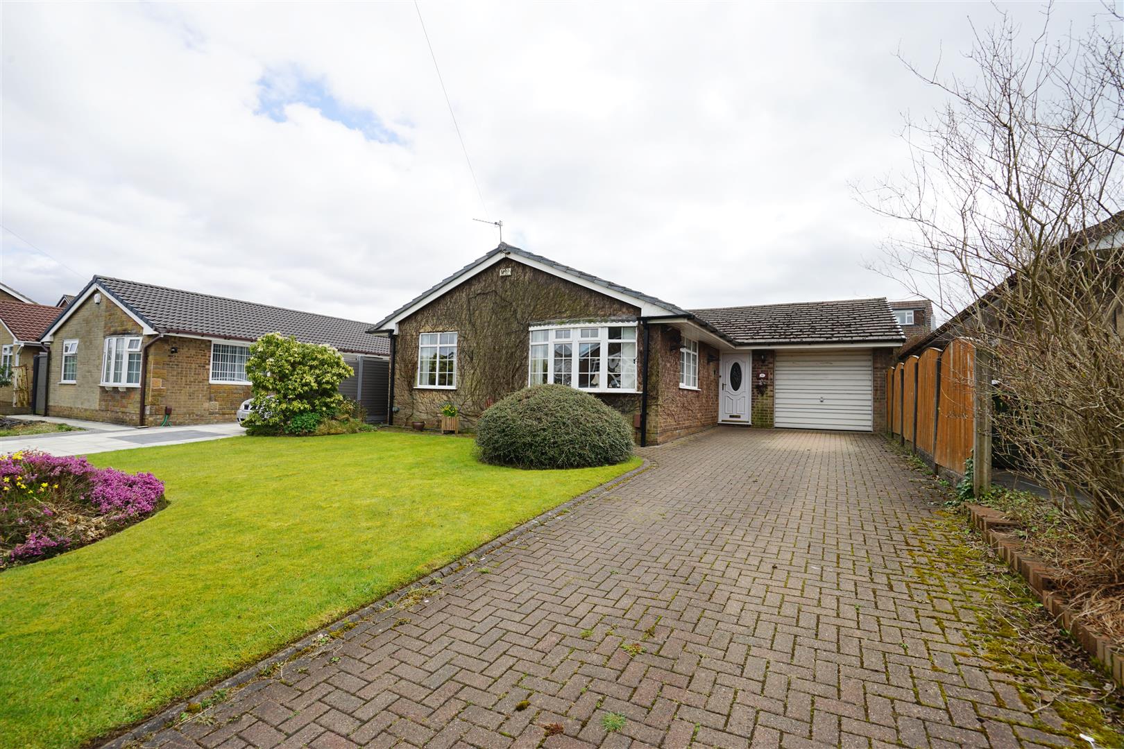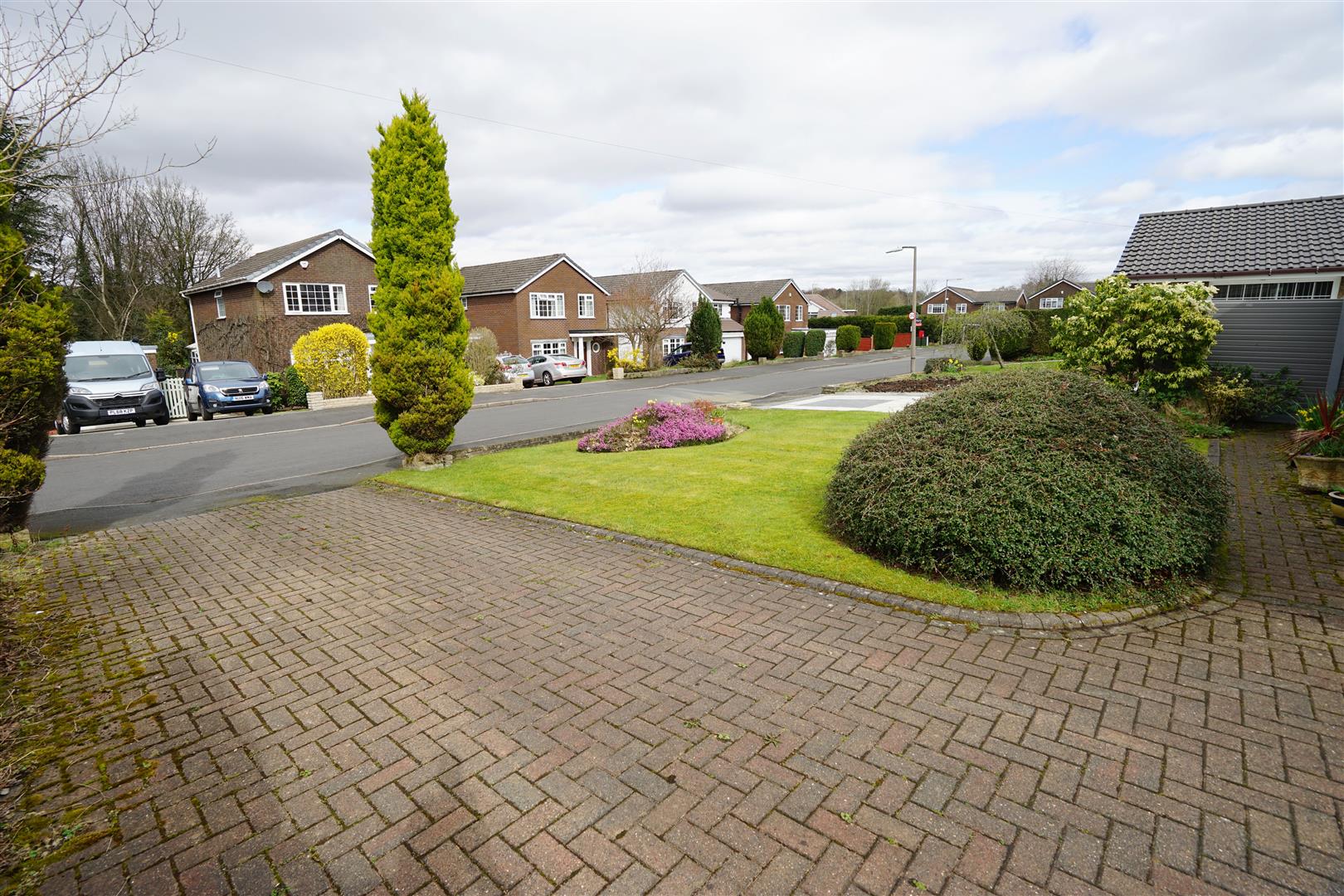 Open plan front garden, brick paved pathway leads to entrance door with lawned area and mature flower and shrub borders with floral bed, block paved driveway to the front and side leading to garage and with car parking space for three cars.