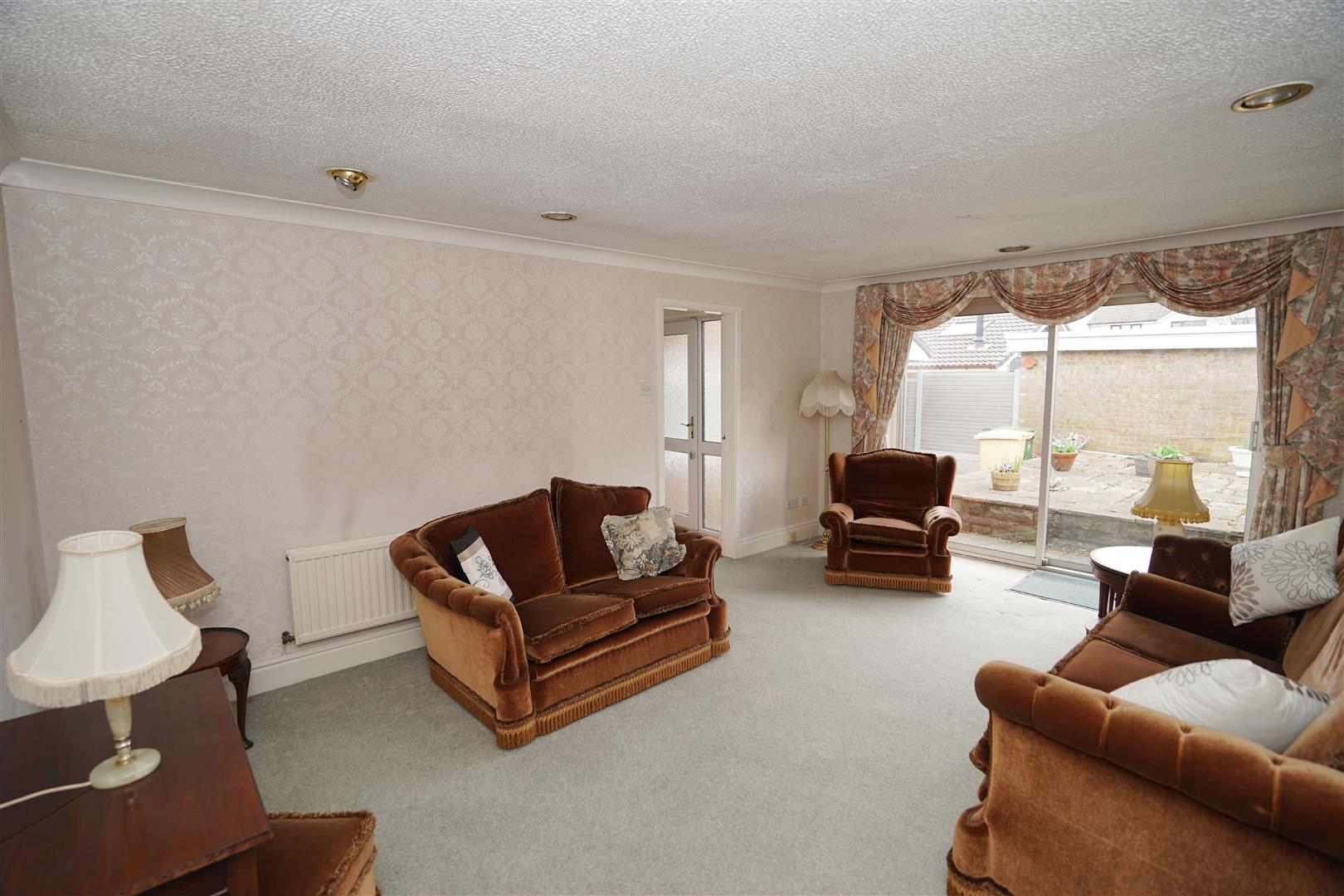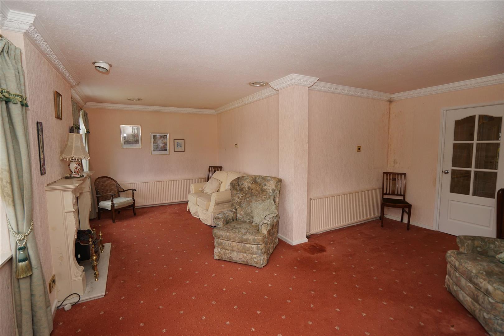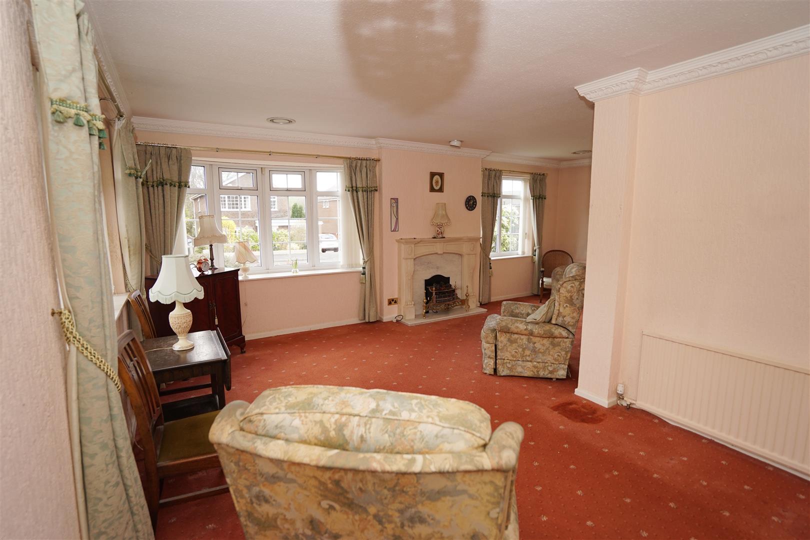 UPVC double glazed window to front, uPVC double glazed window to side, uPVC double glazed bow window to front, fitted electric fire set in ornate surround and marble effect inset and hearth, two radiators, decorative coving to ceiling.