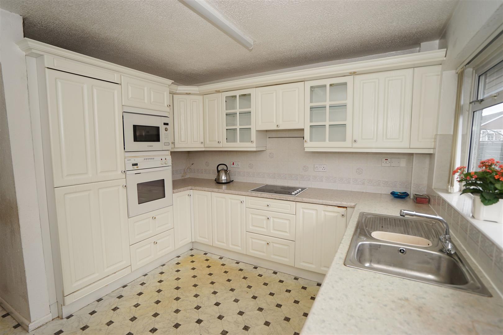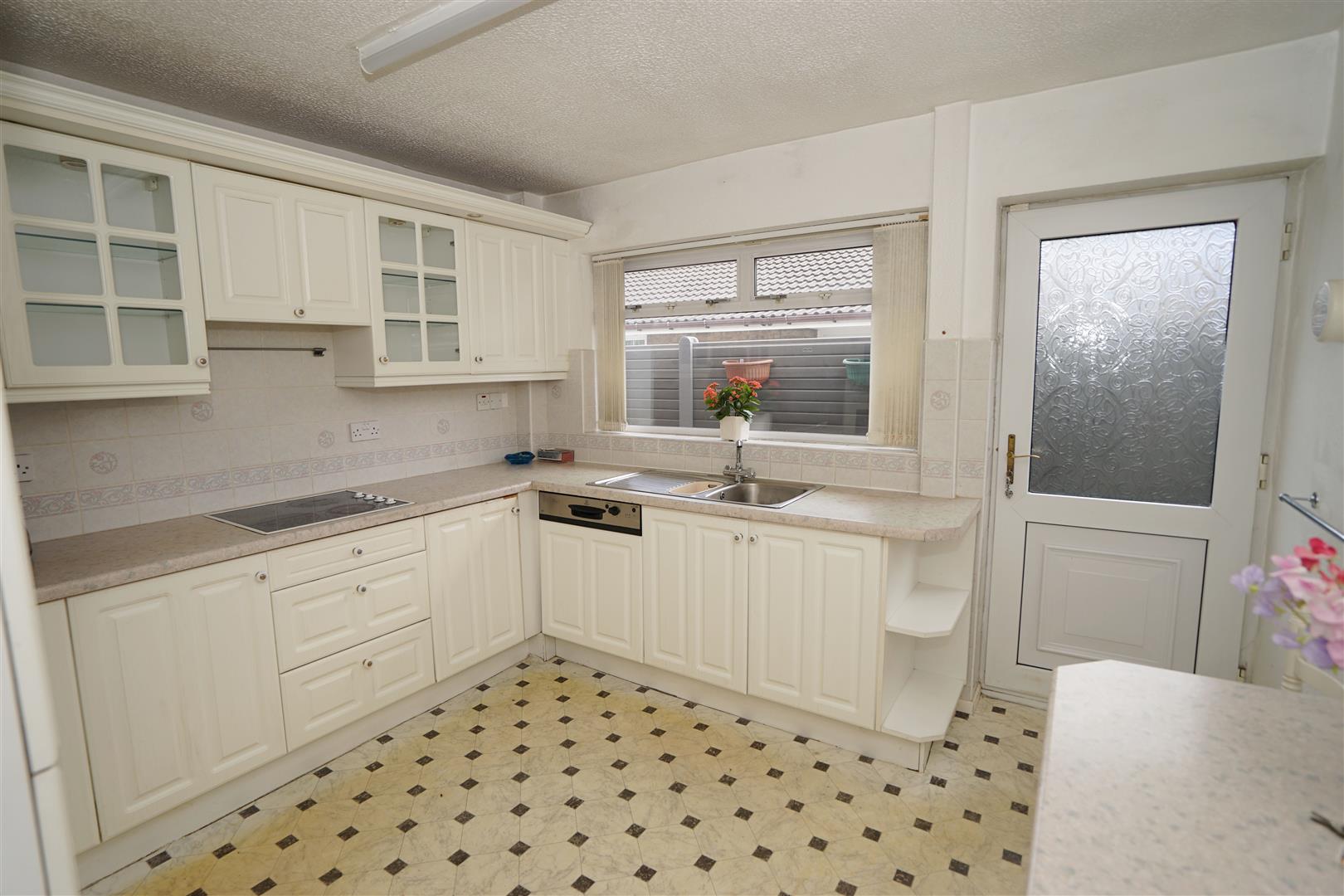 Fitted with a matching range of base units with complementary worktop space, glazed display units, 1+1/2 bowl stainless steel sink unit with tiled splashbacks, integrated dishwasher, built-in eye level electric fan assisted oven, four ring halogen hob with pull out extractor hood over, built-in microwave, uPVC double glazed window to side, uPVC double glazed side door, door to: