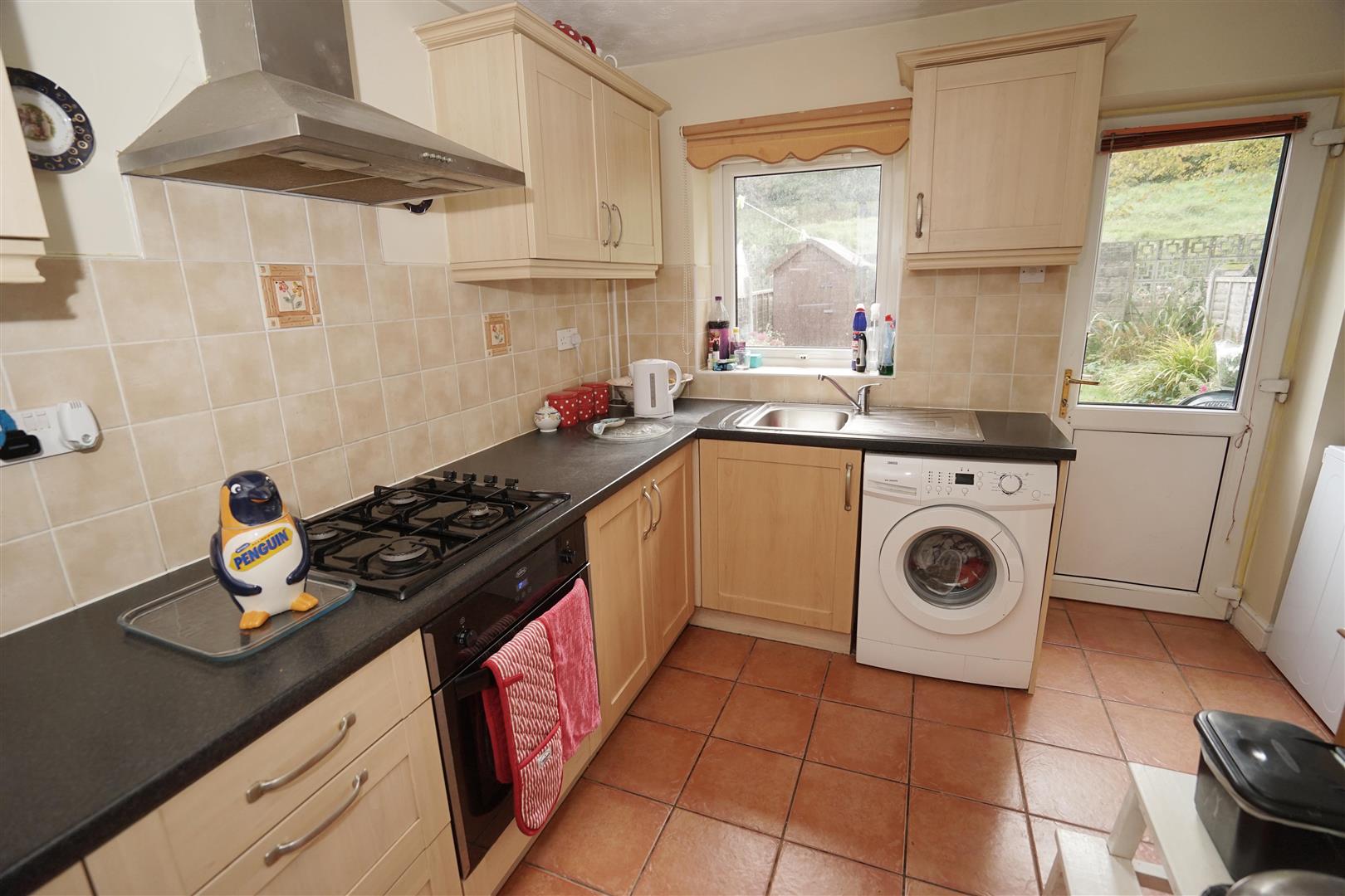Fitted with a matching range of base and eye level units with drawers and cornice trims, stainless steel sink with single drainer and mixer tap with tiled splashbacks, plumbing for washing machine, space for fridge/freezer and tumble dryer, built-in electric fan assisted oven, four ring gas hob with extractor hood over, two uPVC double glazed windows to rear, double radiator, ceramic tiled flooring, ceiling with recessed spotlights, uPVC double glazed door to garden.