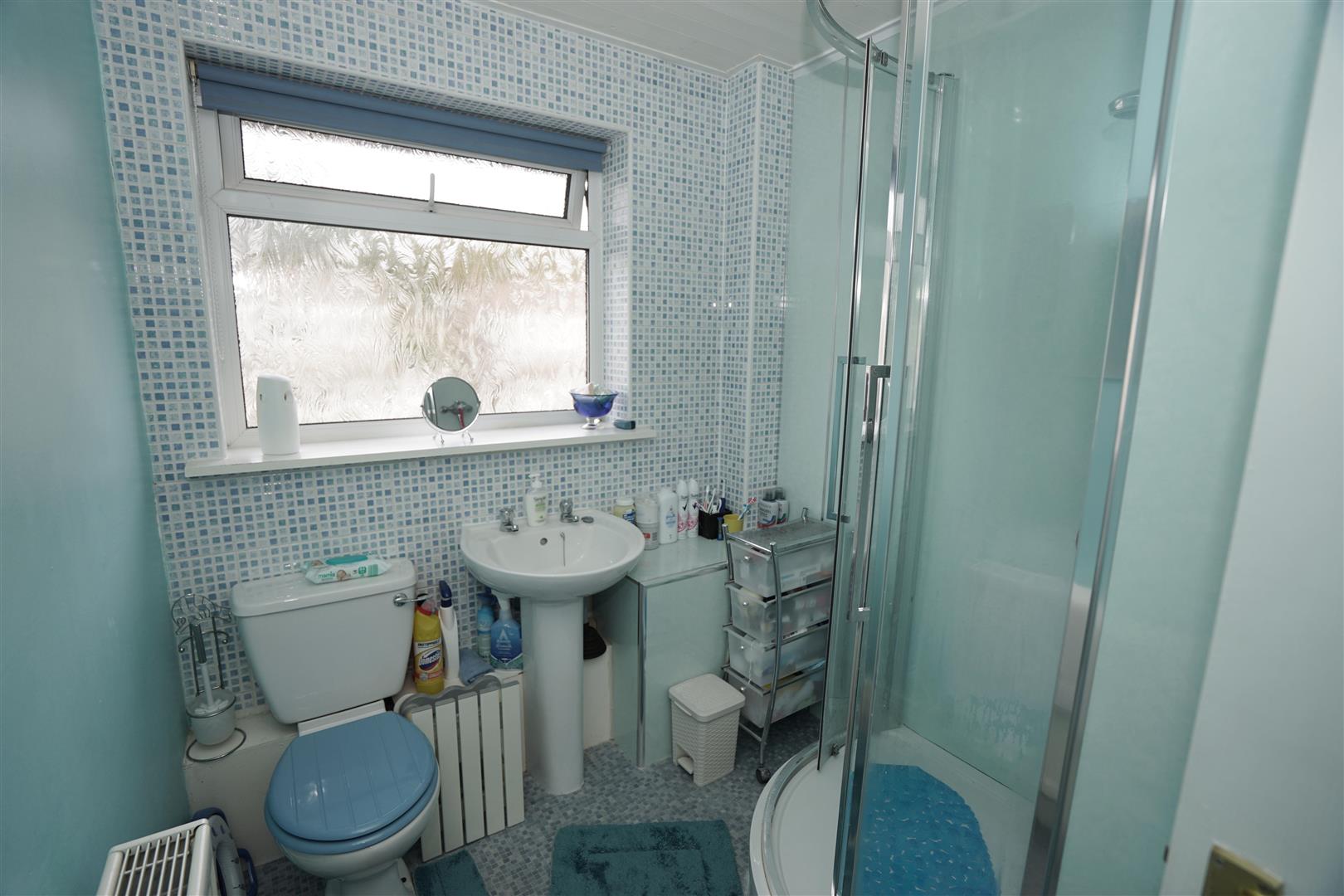 Fitted with three piece modern white suite comprising corner shower enclosure with upvc panelling, pedestal wash hand basin, low-level WC and ceramic tiling to one wall, uPVC frosted double glazed window to front, built-in over-stairs boiler cupboard, housing wall mounted gas combination boiler serving heating system and domestic hot water, radiator.