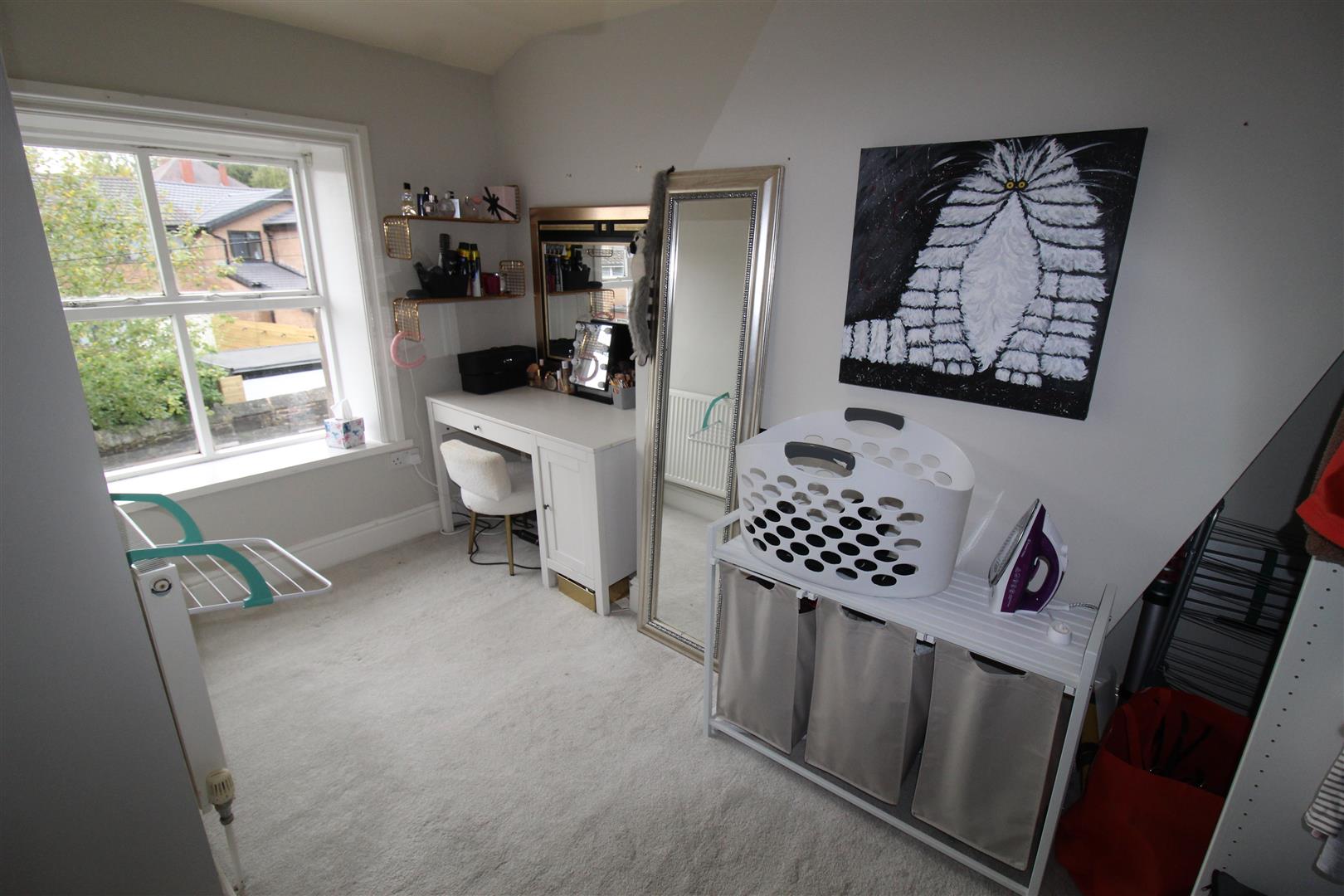 Fitted with three piece modern white suite comprising deep panelled bath with shower over, pedestal wash hand basin and low-level WC, ceramic tiling to all walls, heated towel rail, extractor fan, frosted window to rear, built-in under-stairs storage cupboard, .