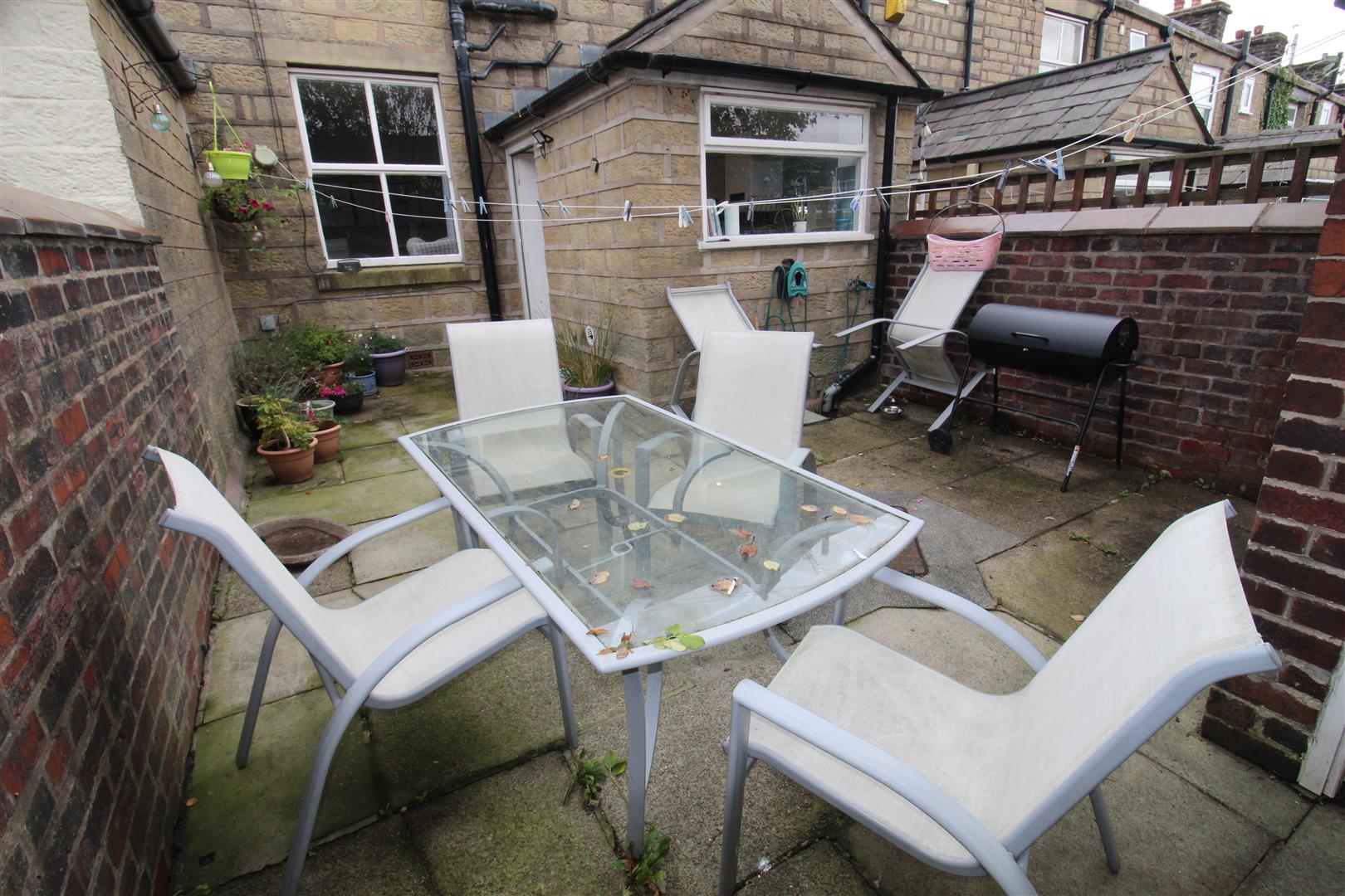 Enclosed rear yard laid to paving with patio dining and seating area.